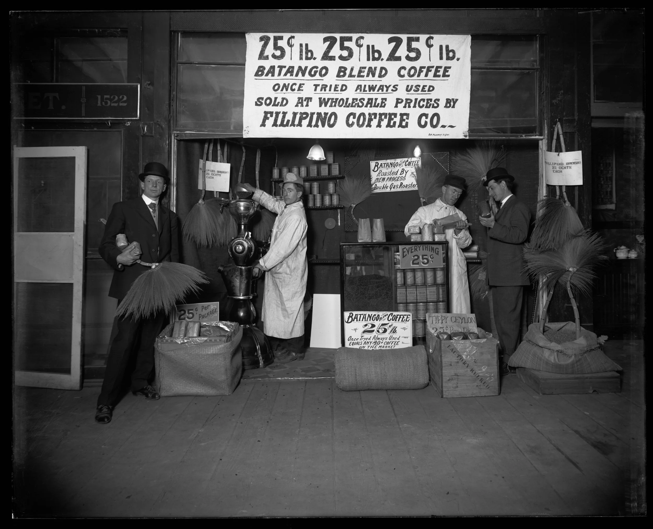 This project began with an old photograph I uncovered while doing research at the University of Washington as an undergrad. The photograph was of the Filipino Coffee Co. and was taken in 1909 at Seattle’s famous Pike Place Market, 62 years before the first Starbucks opened its doors. So many questions came to mind when I first saw the image: who are these men? Why are they selling coffee beans from the Philippines? Coffee is grown in the Philippines?